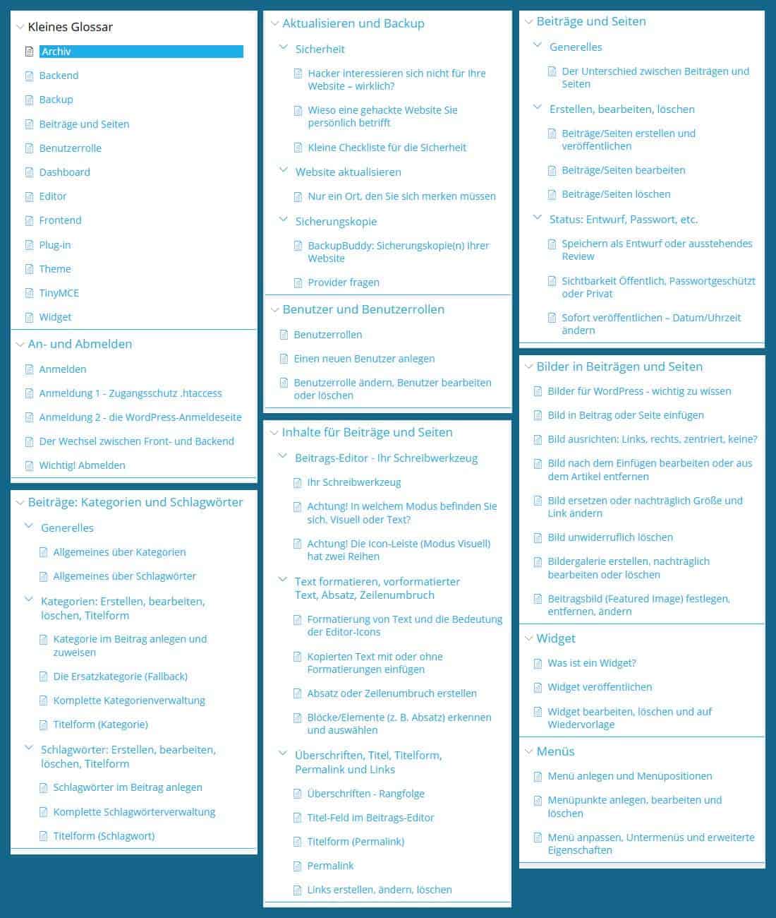 Die WordPress-Grundlagen erklären alle Dinge, die mit der Rolle „Redakteur“ erlaubt sind. Darüber hinaus werden ein paar Bereiche der Rolle „Administrator“ angesprochen: „Benutzer-Management und Aktualisieren“. Die Kapitel sind auf dem Foto gelistet (Klick für Vollbild-Ansicht, dann Rechtsklick „Grafik/Bild anzeigen“):