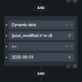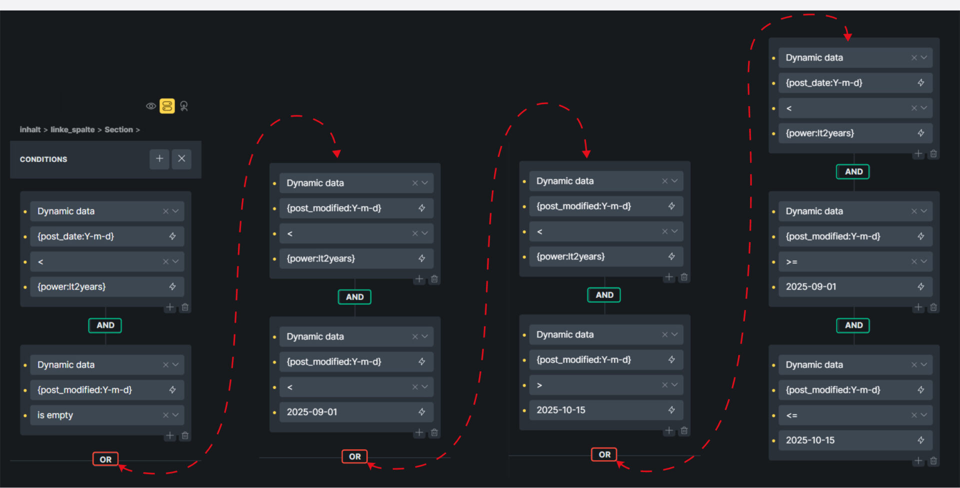 Die vierte ODER-Kondition: ODER wenn das Veröffentlichungsdatum älter/kleiner ist als das aktuelle Datum minus 2 Jahre UND das Aktualisierungsdatum neuer/größer oder gleich 1.9.2025 UND das Aktualisierungsdatum älter/kleiner oder gleich 15.10.2025 ist.