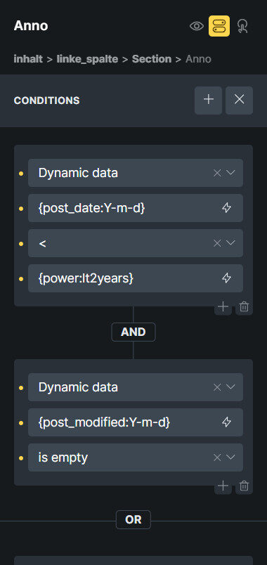 Erste ODER-Kondition: Der Hinweistext wird angezeigt, wenn die oben erstellte erste Kondition zutrifft ODER wenn das Aktualisierungsdatum älter/kleiner ist als das aktuelle Datum minus 2 Jahre UND das Aktualisierungsdatum älter/kleiner als der 1.9.2025 ist.