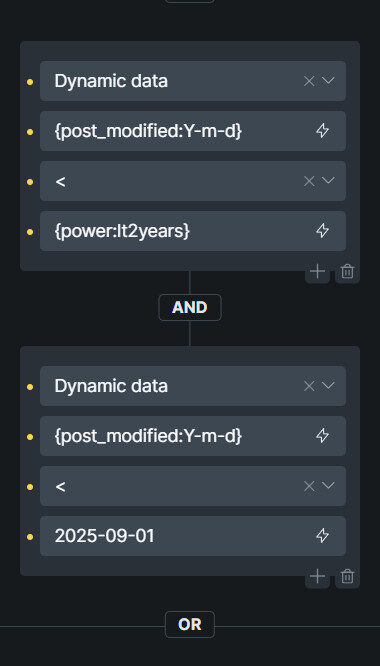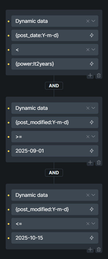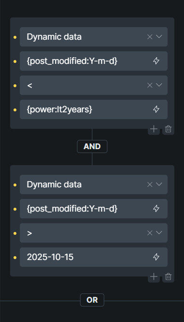 • Das Veröffentlichungsdatum ({post_date:Y-m-d}) ist älter/kleiner (<) als das „aktuelle Datum minus 2 Jahre“ ({power:lt2years}).