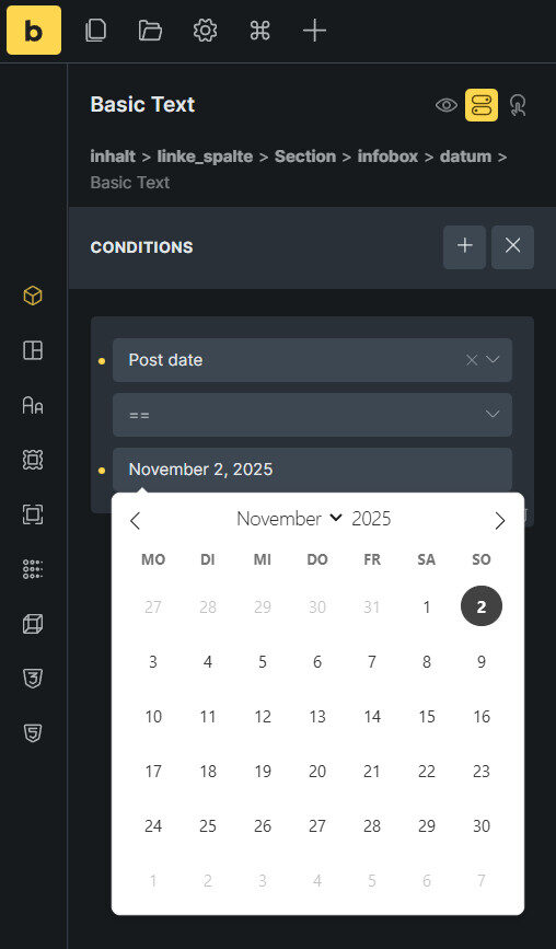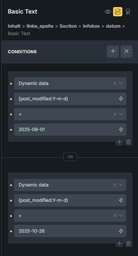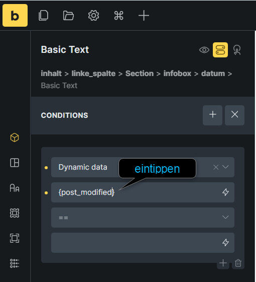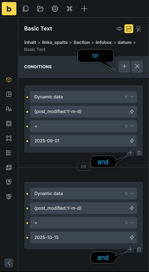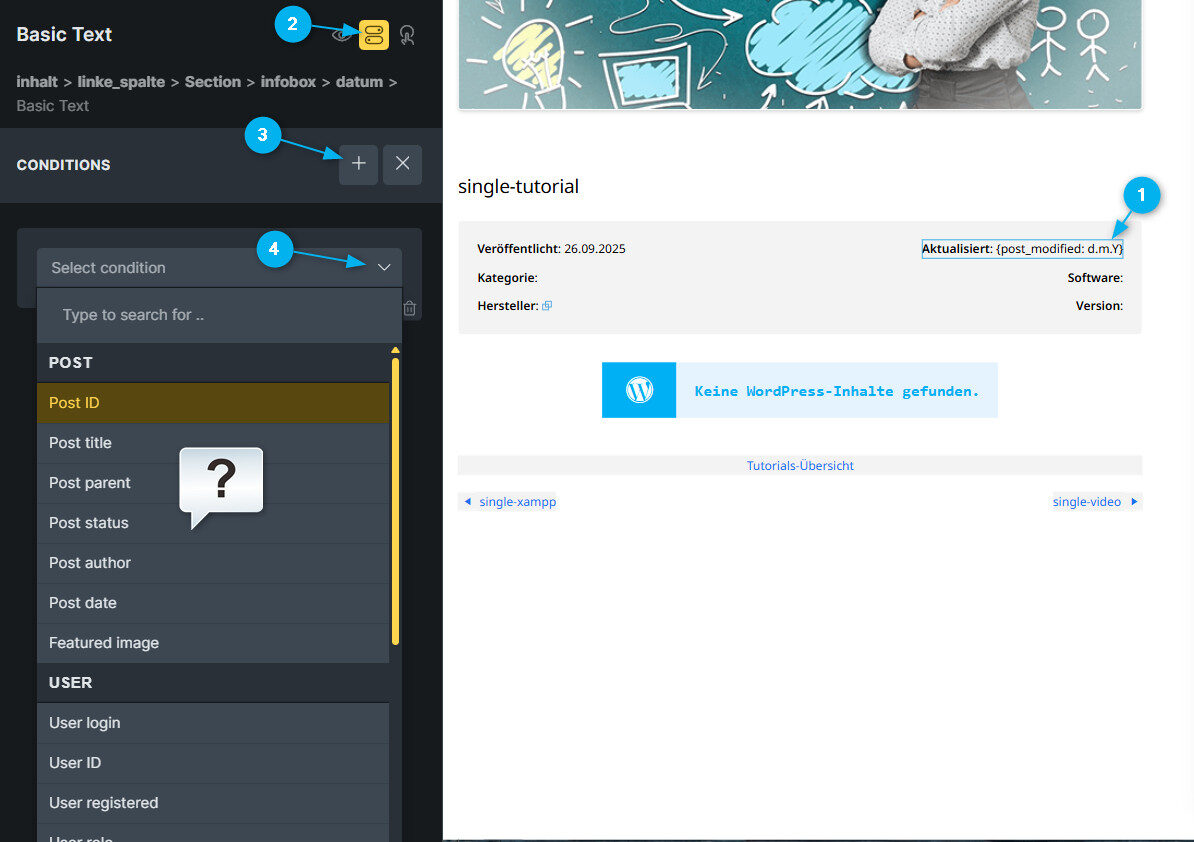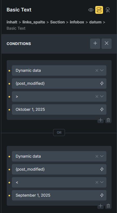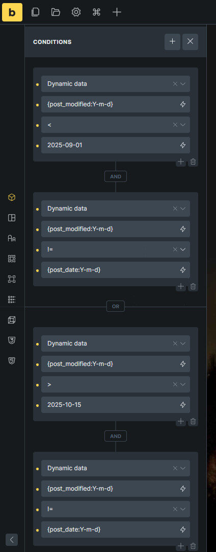 Dieses Tutorial zeigt nicht nur den Prozess, Bedingungen für einen Zeitrahmen zu erstellen, sondern auch, wie {post_modified} für eine Kondition in Bricks angesprochen wird.